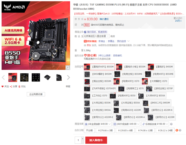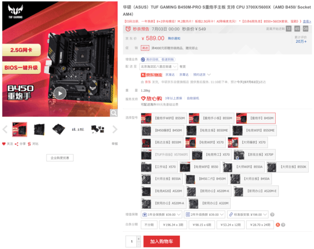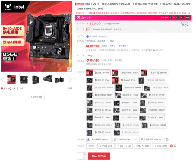 此外还有带WiFi6无线网卡的TUF GAMING B560M-PLUS WIFI重炮手可入手,7月3日京东秒杀价999元,另有3期免息福利。
