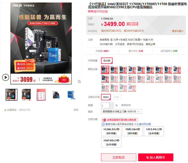 且天猫商城还有华硕B560重炮手主板搭i7-11700F处理器套包,券后到手价3399元,晒单还送50元红包,另享6期免息福利,感兴趣的小伙伴速速来抢