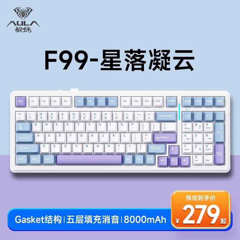 狼蛛F99 99键多模无线机械键盘,现正火热促销中,使用满350减100优惠券并叠加国家补贴后,最终到手价仅需237.15元!这款键盘采用高品质Gasket结构设计,搭载PCB单键1.2mm开槽与FR4双面沉金定位板,有效提升敲击手感与声音一致性,配备PBT材质键帽纹理细腻耐磨耐用,支持全键轴座热插拔,可自由更换灵动轴V3、紫皇轴、鲸海轴或灰木轴V3等多种轴体,满足不同用户的输入偏好,提供暗夜国度、星落凝云、粉墨年华、绿野幽谷四种配色选择,颜值与实力兼具,内置8000mAh大电池搭配三模连接(有线/蓝牙5.0/2.4G无线)使用更便捷,双段脚撑与底部防滑橡胶垫设计兼顾舒适与稳定,无论是办公还是游戏都能轻松胜任,目前特价入手正当时,喜欢的朋友千万不要错过