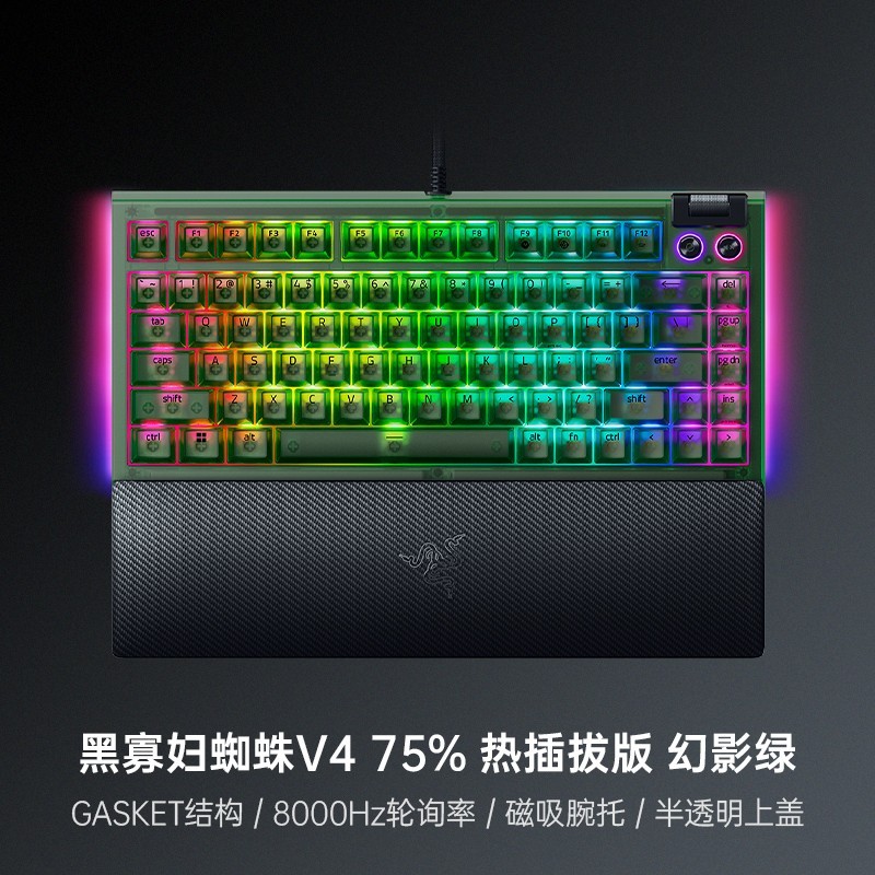 雷蛇黑寡妇蜘蛛V4热插拔75%幻影绿电脑电竞游戏客制机械键盘,专为追求极致操作体验的玩家打造,采用紧凑型75%布局设计,节省桌面空间同时保留功能键完整性,支持热插拔轴体,自由更换不同手感机械轴,满足个性化需求。经典幻影绿配色搭配雷蛇标志性背光灯效,炫酷电竞氛围瞬间拉满。搭载高性能机械开关,触发迅速响应灵敏,无论是激烈对战还是日常打字都能提供出色手感。