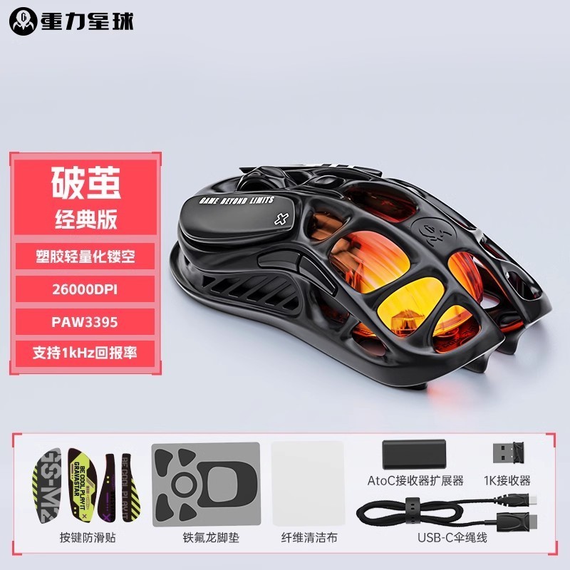这款鼠标是破茧经典版,有着独特的镂空外观和轻量化设计,重量仅79g,适合中、小手玩家。它是塑胶材质,有29孔镂空,80%的高透气率,长时握持能一定程度缓解手汗问题,双层镂空骨骼保障结构强度。还有防尘内芯,避免内部暴露后的清洁难题,机芯有5种RBG灯效。它的分辨率可达26000DPI(6档调节),速度为650IPS,加速度50G,回报率1kHz。主控是BK CX52850,支持蓝牙、有线、无线2.4G三模链接。内置400mAh电池,USB - C接口充电,蓝牙模式续航82小时,2.4G模式续航62小时。微动品牌为凯华,寿命达8000万次。有5个可编程按键,除常见按键外左侧还有前后排列的两个侧键,通过HUB应用可自定义宏命令、灯效、DPI等,并且配件丰富,包含USB - C伞绳线、AtoC接收器扩展器、1K接收器、铁氟龙脚垫、按键防滑贴、纤维清洁布。喜欢的话可以入手。