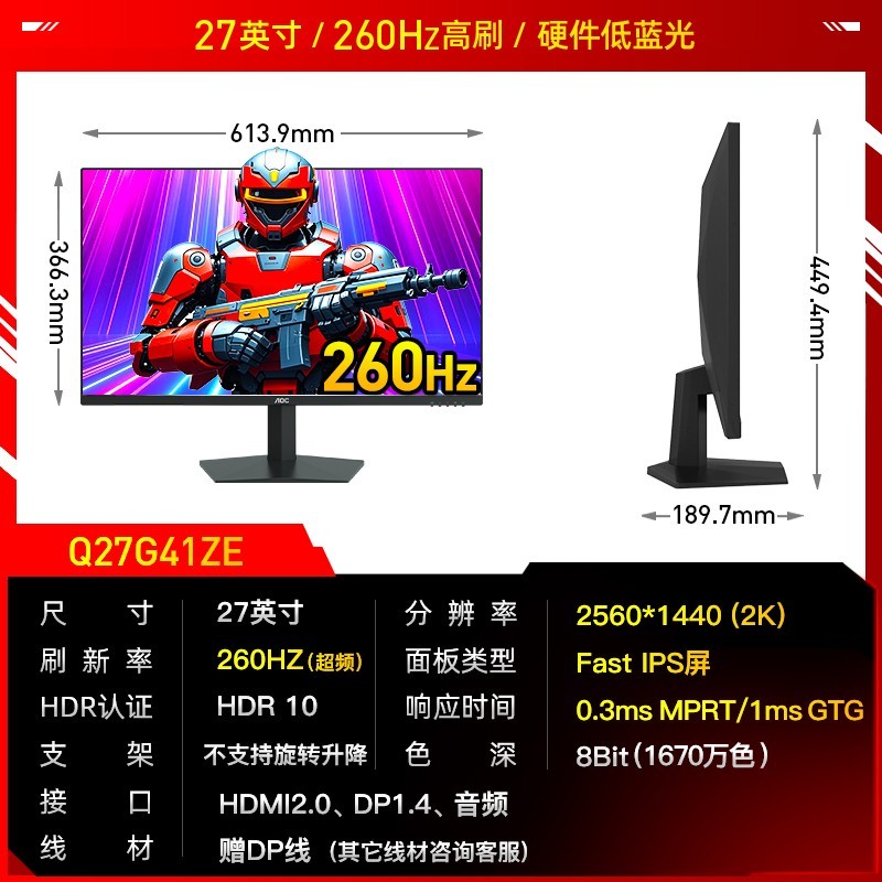 AOC 27英寸2K300Hz硬件圆偏光电脑显示器Q27G4SL/WS是一款专为电竞玩家打造的高性能屏幕搭载Fast IPS技术和HDR10显示增强技术带来细腻逼真的画质表现同时260Hz高刷新率和0.3ms极速响应时间大幅减少画面延迟与拖影让游戏体验更加流畅稳定采用护眼设计有效缓解长时间使用带来的视觉疲劳兼顾娱乐与办公需求非常实用该商品现正在天猫促销原价1373.75元现满1件打8折再叠加国家补贴8.5折后直降164.85元最终到手价仅需934.15元性价比极高喜欢的朋友不容错过