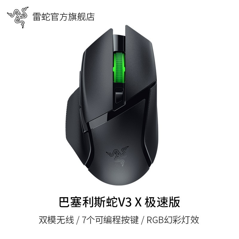 雷蛇 巴塞利斯蛇V3 X极速版 HYPERSPEED WIRELESS 双模鼠标 18000DPI 黑色 RGB 是专为游戏玩家打造的高性能外设利器 采用最新的5G光学传感器 提供高达18000DPI的精准追踪能力 配备7个可编程按键 可根据游戏需求自由设定 提升操作效率 采用Razer HyperSpeed无线技术 实现低延迟 高稳定性的无线连接 同时支持蓝牙5.0和2.4GHz双模连接 满足不同场景需求 鼠标续航表现出色 HyperSpeed模式下可达285小时 蓝牙模式下更是高达535小时 鼠标采用人体工学流线型设计 黑色机身搭配绿色点缀 全新透明滚轮设计 支持约1680万色RGB灯光调节 PTFE滑动脚垫确保操作顺滑无阻 旗舰店现价499元 本店参加满199减150和满1件打9.5折的双重优惠 最终到手价仅312.55元 性能与颜值兼具 喜欢的朋友不要错过