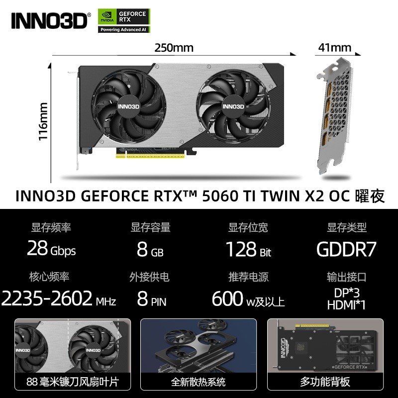 映众电竞叛客GeForce RTX 5060 Ti TWIN X2 OC 8GB曜夜独立显卡,专为电竞与创意设计打造,配备8GB GDDR6显存,支持DLSS 4技术,带来更流畅的游戏体验与更高效的AI运算渲染能力,适配黑神话:悟空等热门游戏及专业设计需求。