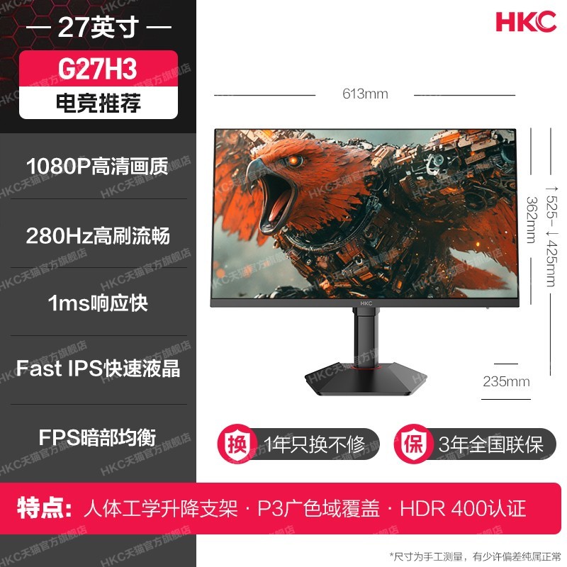 HKC推出的27英寸电竞游戏显示器VG273K,是一款专为游戏玩家打造的电脑高清屏幕。其颜色分类为?27猎鹰Ⅱ代,具备FastIPS技术,拥有280HZ高刷,能让游戏画面更加流畅,为玩家带来丝滑的游戏体验。它的分辨率为1080P高清,可实现升降竖屏操作,响应速度快达1MS,还具备HDR400高动态显示效果。在套餐类型方面为官方标配。