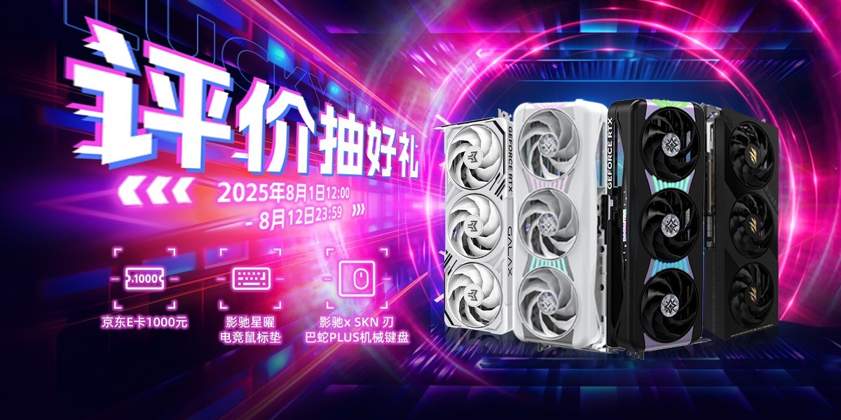 2025年8月1日12:00—2025年8日12日23:59,在影驰京东自营旗舰店,购买本店任意RTX5060 Ti 16G、RTX5070、RTX5070 Ti、RTX5080的显卡,且7天内未产生退货,完成15字以上优质评价+2张图片后,即可参与抽奖活动。