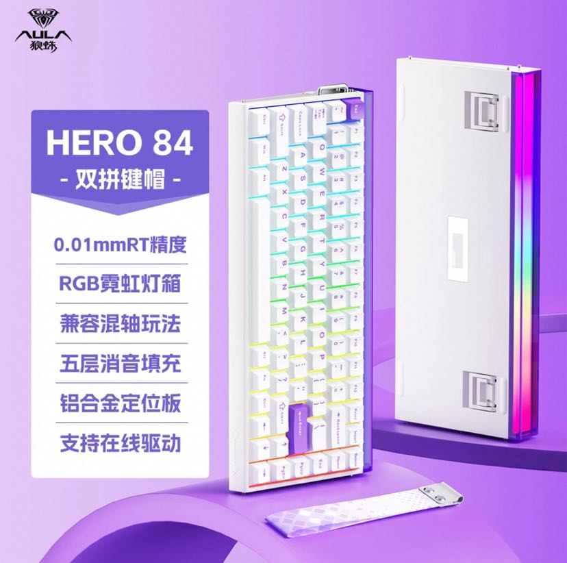 狼蛛HERO84有线磁轴机械键盘黑皇磁轴白紫双拼正刻来啦!这款键盘有着独特的魅力。它采用黑皇磁轴,在轴体性能上表现出色,能给使用者带来不一样的敲击手感。其白紫双拼正刻的键帽设计,颜值超高,为你的桌面增添一抹独特的色彩。