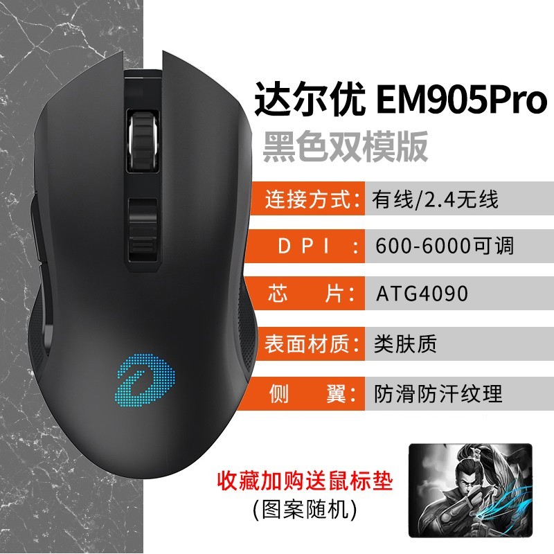 达尔优 EM905有线无线双模游戏鼠标专为电竞爱好者打造,支持有线无线双模连接,切换更灵活,适用LOL/CF吃鸡等多种热门游戏,也可用于办公场景,性能稳定耐用。鼠标采用人体工学设计,握感舒适,操作更精准。本次促销仅需88.99元,降价前售价109.00元,立省20元,降幅达18%,与上次爆料价相当,是入手的绝佳时机。颜色可选黑色,套餐为官方标配,品质保障,值得信赖。