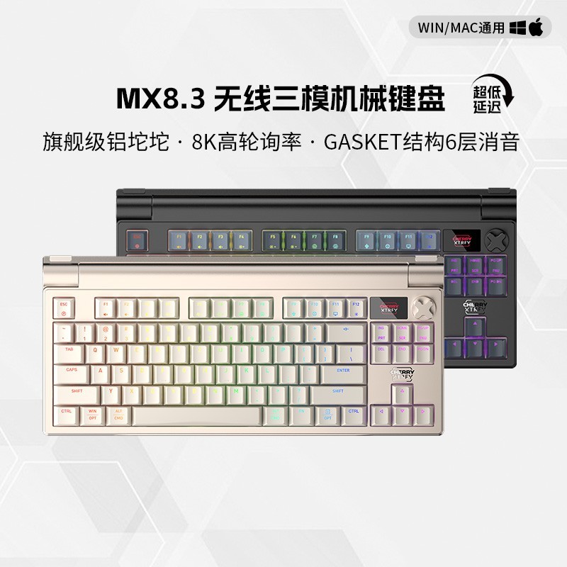 CHERRY MX8.3客制化8K铝坨坨无线三模机械键盘是一款兼具性能与颜值的高端外设装备采用95%铝合金打造坚固机身搭配6层消音结构与Gasket设计理念带来更稳定舒适的敲击体验支持无线三模连接实现<1毫秒超低延迟兼容多种使用场景配备8K扫描率红轴带来顺滑线性手感彩屏旋钮设计个性十足可自由定制显示内容轻松提升桌面格调当前在天猫商城促销中轴体为红轴颜色为星陨灰版本原价2222元现在入手仅需1888元性价比出众喜欢的朋友不妨考虑入手
