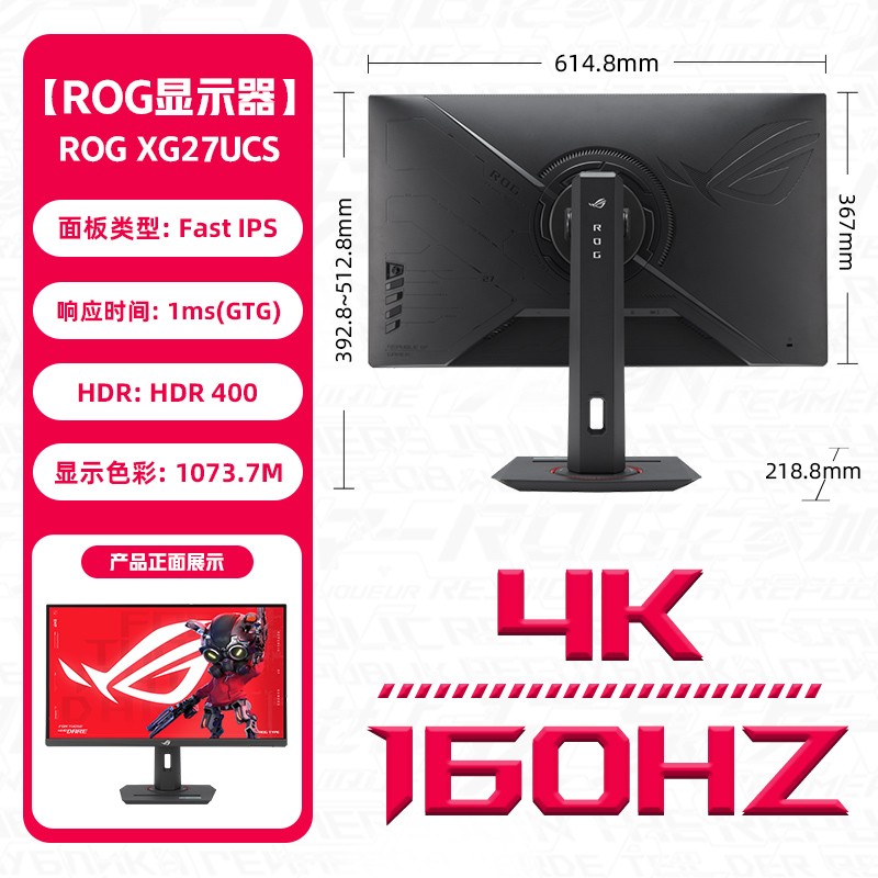 华硕ASUS ROG玩家国度PG27UQR 27英寸IPS G-sync FreeSync显示器现正火热促销中,这款专为高端玩家打造的显示器搭载了3840×2160分辨率的4K IPS面板,刷新率高达160Hz,响应时间低至1ms(GTG),支持HDR600显示技术,带来更明亮更细腻的画面表现。拥有95% DCI-P3广色域覆盖,色彩表现更加精准,满足专业游戏与设计需求。接口方面配备DisplayPort 1.4、HDMI 2.1和USB 3.2 Gen 1 Type-A,扩展能力强大。同时支持ELMB-SYNC技术,有效减少画面撕裂与拖影,提升游戏流畅度。显示器底座支持多向调节,适配不同使用场景,亦支持VESA壁挂安装。