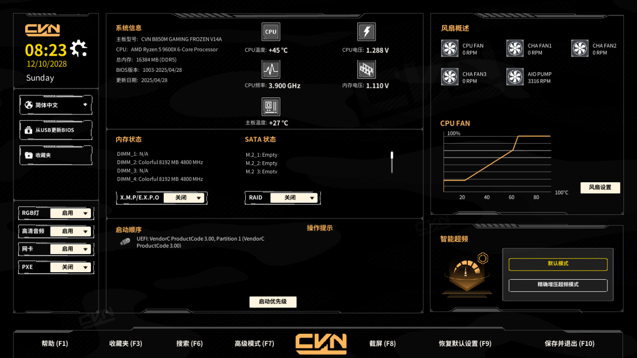 想体验千帧电竞还需要开启一些前置的游戏功能,首先我们进入七彩虹主板的BIOS,在主页的左上方将语言更改成简体中文,然后打开XMP/EXPO功能,加载内存的6000C28的预设,然后点击开启右下角的“精准增压超频模式”(一键PBO)。