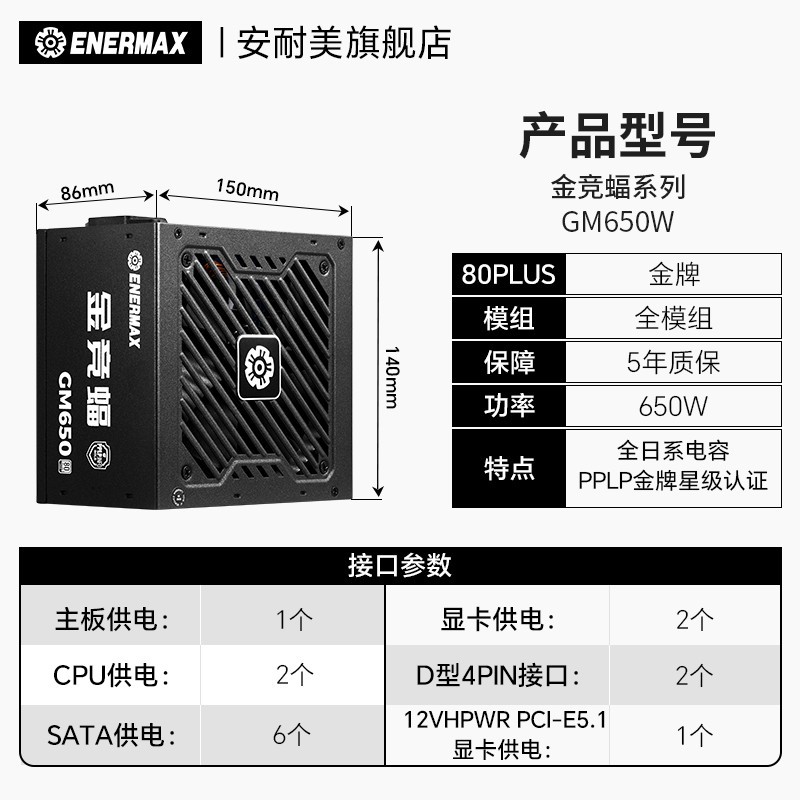 Enermax 安耐美 电源650W 金竞蝠GM650W ATX3电源 金牌全模组设计稳定高效 全日系电容保障持久耐用 FDB动态液压风扇静音又高效 五年质保安心使用 颜色分类为GM650W(ATX3.1/金牌全模/全日系)目前天猫商城促销价仅需359元/件 原价443元 省下84元 性价比超高 喜欢的朋友可以果断入手