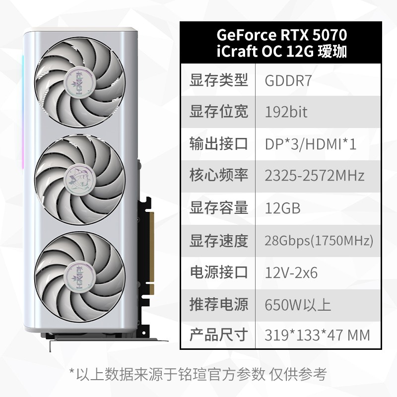 铭瑄GeForce RTX4070 Super iCraft OC12G瑷珈显卡正在天猫商城促销。其显存容量为12GB。这是英伟达RTX 4070 Super中期小改款显卡,Super后缀意味着性能提升。它基于NVIDIA Ada Lovelce架构,采用TSMC 4N定制工艺制程打造,有新型SM多单元流处理器、第三代RT Core、第四代Tensor Core、双NVIDIA编码器以及着色器执行重排序等新特性,在图形基准性能、实时光线追踪、AI加速以及性能功耗比方面最高提升2倍,还有RTX40系列独占的DLSS3游戏画质超采样技术。规格上,搭载AD104 - 350 GPU核心,有7168个CUDA内核,比RTX4070多1280个流处理器,提升幅度约22%,基础频率1.98GHz,加速频率2.48GHz,采用12GB GDDR6X显存,21Gbps显存速度,192 bit显存位宽,L2缓存由36MB提升至48MB与RTX4070Ti一致,基本全面向着RTX4070 Ti靠拢,外接16 pin供电,显卡功耗220W,NVENC编码器被阉割到1个。