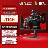 AOC G4 宙斯盾 Q27G4/D 27英寸显示器,采用IPS面板,支持2560×1440高清分辨率,200Hz高刷新率搭配G-sync和FreeSync防撕裂技术,带来流畅顺滑的游戏体验,119% sRGB广色域覆盖和HDR400认证,色彩表现更加真实细腻,助你掌控战场先机。