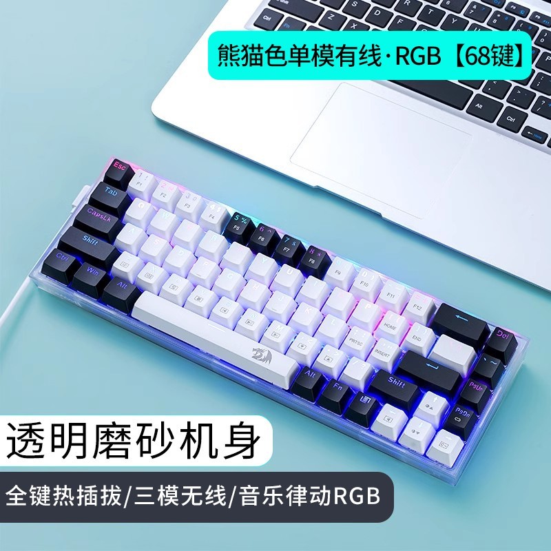 REDRAGON红龙TS68RGB机械键盘,拥有有线、无线、蓝牙三种连接模式,采用68键设计,简约便携。它具备透明客制化热插拔功能,玩家可自由更换轴体,打造专属手感。轴体为青轴,打字节奏感十足,段落感清脆,适合游戏电竞。颜色是TS68 B单模有线熊猫色,经典配色颜值高。套餐为官方标配。