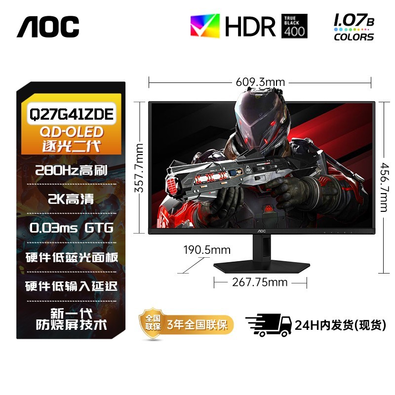 AOC推出的这款26.5英寸的电竞游戏显示器Q27G41ZDE,型号为Q27G41ZDE ,绝对是游戏玩家的福音。它拥有2K分辨率和高达280Hz的刷新率,能带来流畅清晰的游戏画面,让你在游戏中快人一步。原生10Bit色彩显示,色彩过渡细腻自然,呈现出丰富绚丽的色彩世界。响应时间仅0.03ms,有效减少画面拖影和模糊,让游戏中的每一个精彩瞬间都能清晰捕捉。具备6轴调色功能,可根据个人喜好精准调节色彩。还有硬件低蓝光和TUV认证,能有效呵护你的眼睛,减少用眼疲劳。
