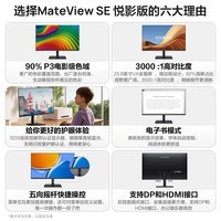 华为 HUAWEI MateView SE悦影版显示器,23.8英寸VA全面屏设计,带来92%高屏占比与178°宽广可视角度,展现细腻清晰的画面效果。拥有90% P3电影级色域与99% sRGB色域,搭配出厂色彩校准技术,色彩表现精准,细节呈现更真实。支持75Hz刷新率与FreeSync防撕裂技术,画面流畅无拖影。通过SGS低视觉疲劳认证及德国莱茵低蓝光、无频闪双重护眼认证,长时间使用更舒适。特别配备电子书模式,模拟纸质显示效果,阅读更轻松。搭载五向摇杆设计,操作OSD菜单便捷高效,支架支持俯仰调节,满足多种使用场景需求。配备DP及HDMI接口,兼容各类笔记本及台式机。
