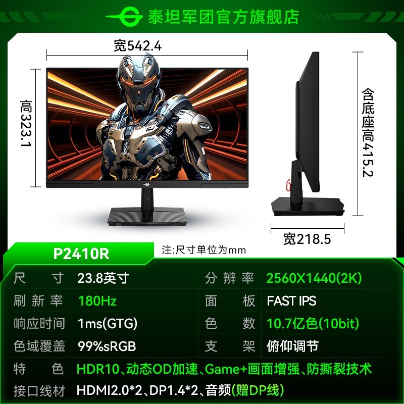 TITAN ARMY泰坦军团P2510R 24.5英寸显示器值得关注!它采用新一代FAST - IPS快速液晶面板,既延续了普通IPS色彩丰富的优点,又在刷新率、响应速度方面有显著提升。拥有2560×1440QHD高清分辨率,99%sRGB,原生8bit色深,色彩表现出色。170Hz刷新率、1 ms GTG快速响应,让画面流畅不卡顿。Adaptive - Sync自适应垂直同步技术能动态调整显示器刷新率,消除画面撕裂及帧率不稳定的情况,减少画面延迟,保障游戏画面清晰完整,且兼容A卡和N卡。还有PIP/PBP智能分屏功能,可同时接驳两台主机呈现双画面。使用滤蓝光灯珠并搭配DC不闪屏调光,双重呵护眼睛健康。接口部分有HDMI2.02 + DP 1.4 + Audio out。