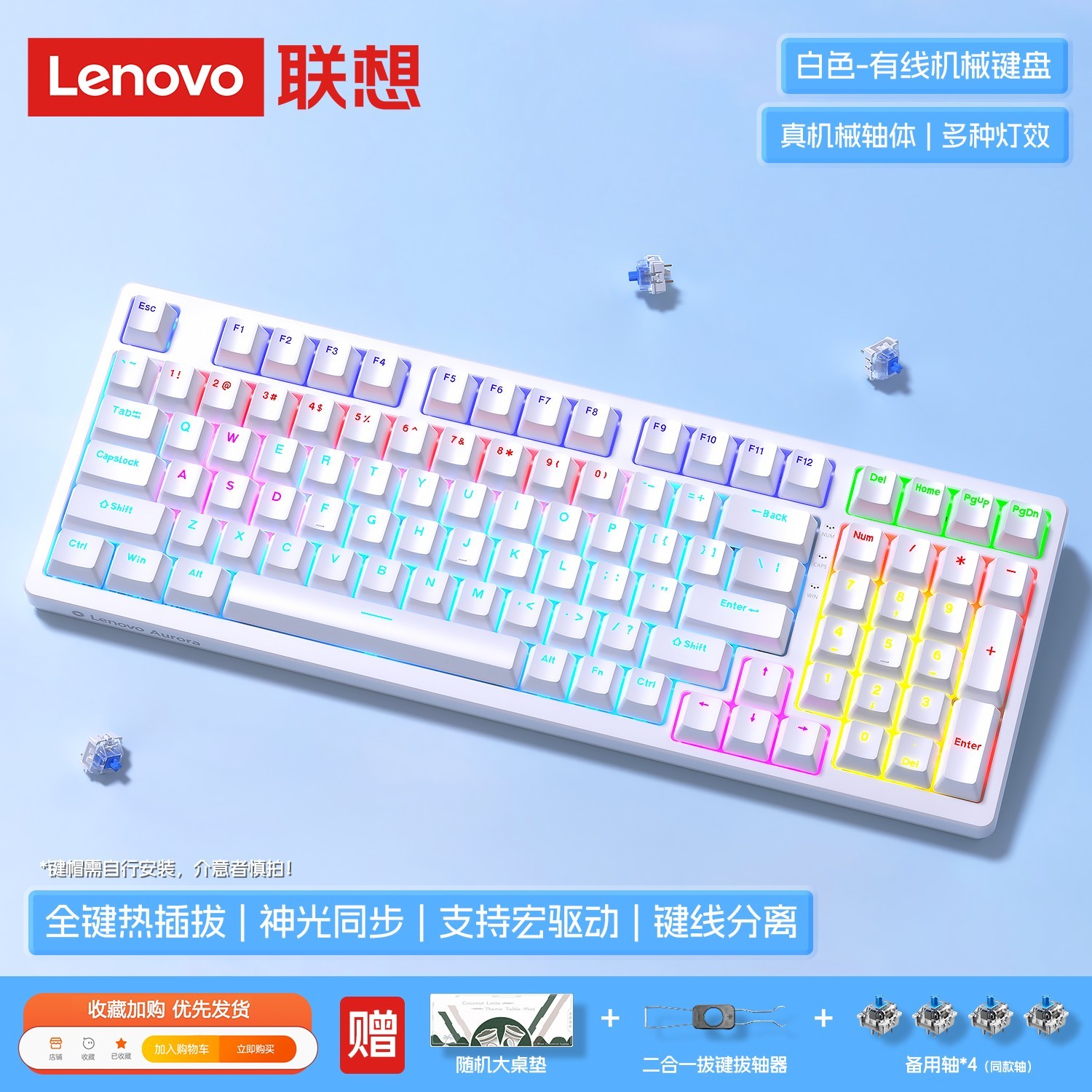 联想Lenovo推出的这款98键有线电竞游戏办公机械键盘,支持神光同步,适用于电脑和笔记本。它采用青轴,声音清脆,按键反应强,给你带来出色的打字和游戏体验。键盘有颜色可选,购买该颜色还赠送大桌垫和备用轴,套餐为官方标配。这款原本售价149元的机械键盘,在天猫商城促销,最终到手价仅99元/件,喜欢的朋友可以入手。