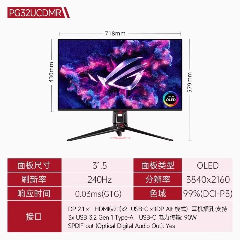 华硕ASUS ROG超神32 OLED显示器,拥有32英寸大屏,具备4K 240Hz的高规格配置,是电竞玩家的理想之选。