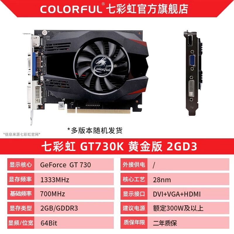 七彩虹COLORFUL GT730K黄金版2GD5显卡2GB黑色现正限时特惠到手价仅需249.00元降价前售价299.00元本次直降50元降幅高达17%性价比大幅提升该显卡搭载2GB大容量显存配备高效稳定的GDDR5显存类型能够流畅应对日常办公高清影音及主流游戏需求七彩虹GT730K黄金版采用高品质用料与静音散热设计运行稳定低功耗更节能兼容性强适配多种主流平台无论是升级旧机还是组装新主机都是理想之选现价仅需249元还享正规渠道保障品质可靠机会难得不容错过
