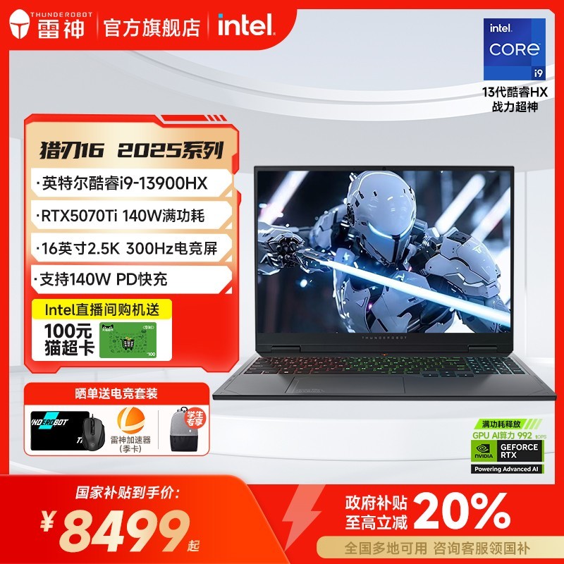 雷神猎刃16 2025款电竞游戏笔记本电脑搭载英特尔酷睿13代i9-13900HX处理器与满血版RTX5070Ti显卡,配备16英寸2.5K分辨率300Hz高刷屏,带来极致流畅的视觉体验和强悍性能输出,无论是大型3A游戏还是高强度创作任务都能轻松应对。本机配置1TB固态硬盘和16GB内存,运行迅捷,存储充裕,满足各类高效需求。