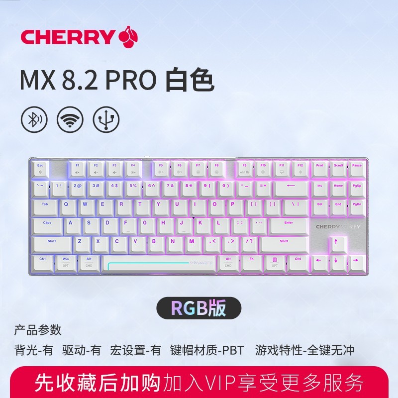 CHERRY MX8.2磁轴无线三模电竞游戏机械键盘震撼来袭,专为追求极致性能的玩家打造,搭载高精度磁轴技术,触发更快更精准,支持热插拔设计,自由更换轴体满足个性化需求,兼容多种机械轴体,带来前所未有的操控体验。键盘支持2.4G无线、蓝牙和有线三模连接,稳定传输低延迟,适配多设备多场景使用,无论是游戏对战还是日常办公都能轻松应对。RGB彩光系统炫酷夺目,灯光效果丰富可调,点亮你的专属电竞氛围。