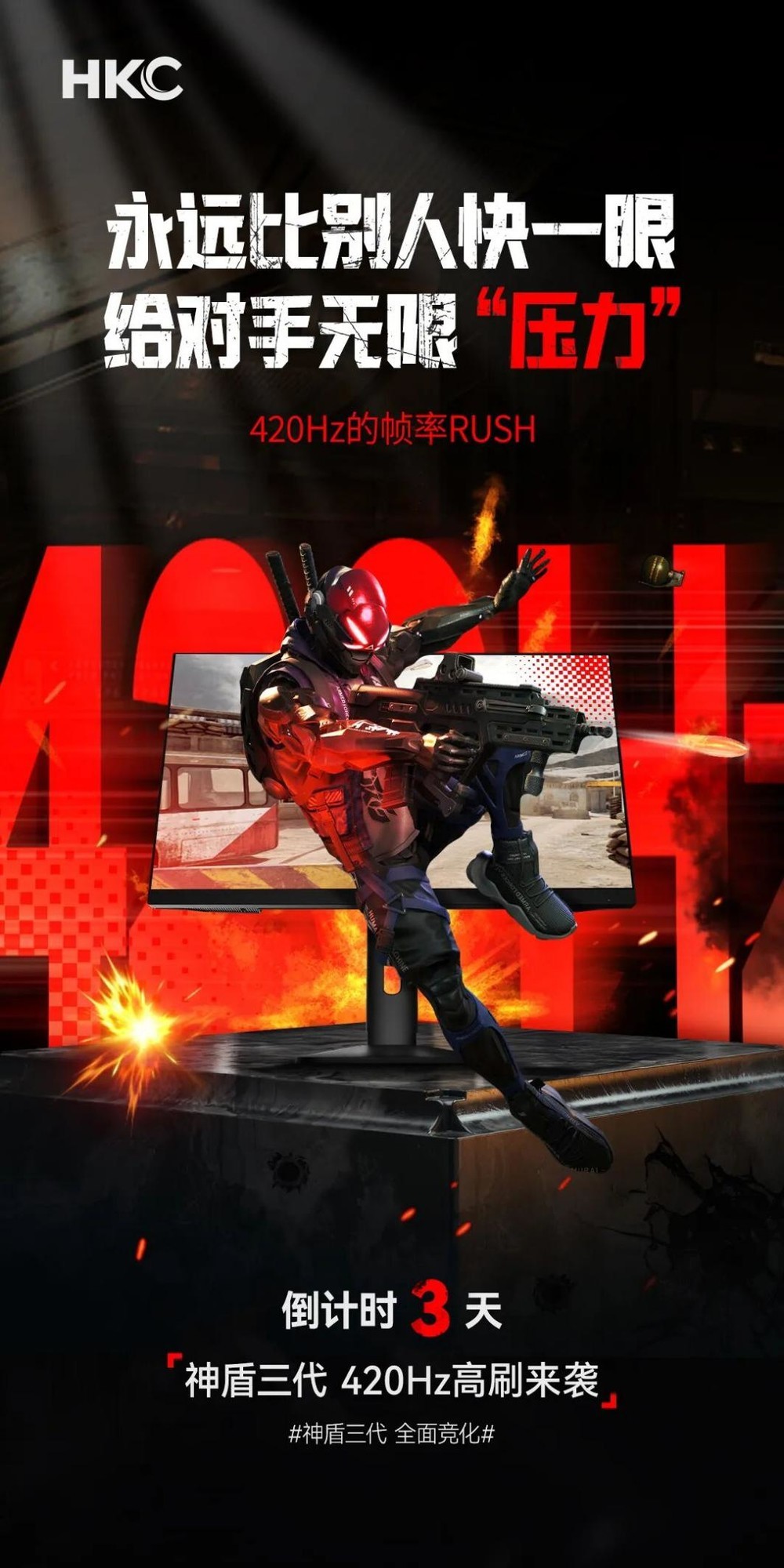 此外从海报中还能看到新品将拥有420Hz的刷新率,并支持DIC 2.0技术,响应时间低至0.5ms,还将搭载闪灭速晰功能,不难看出新品将面向广大FPS玩家,此次新品的发布或将改变HKC品牌中不同系列的定位,对于普通用户来说,也能更好地进行选购。目前这款产品的定价尚未公布,笔者也将持续关注,并将第一时间带来新品的体验评测,敬请期待。