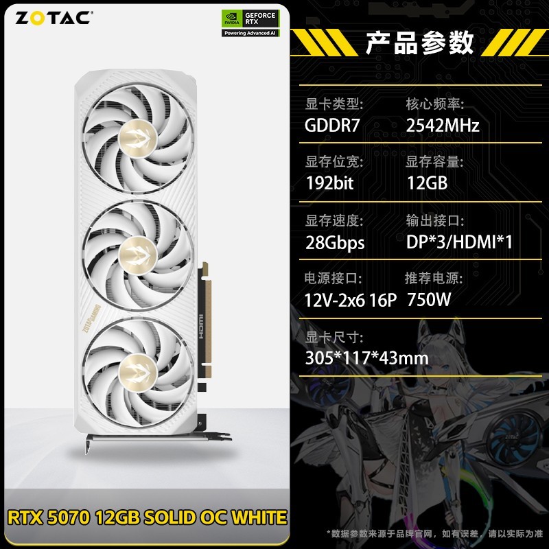 索泰GeForce RTX 5070显卡DLSS4游戏AI设计12GB SOLID/XGAMING/OC,性能强劲,专为高端游戏与AI创作打造,搭载12GB大显存和全新DLSS4技术,带来更流畅的游戏体验与更快的渲染速度,无论是3A大作还是专业设计建模都能轻松应对。