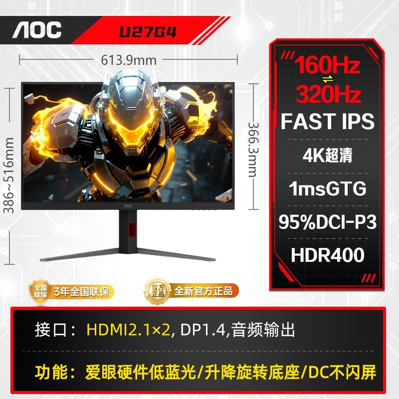 AOC G4宙斯盾推出的U27G4 27英寸显示器值得关注。它采用IPS面板,拥有3840×2160的高分辨率、320Hz的高刷新率、95% DCI - P3广色域以及HDR400技术,还具备MBR Sync功能。
