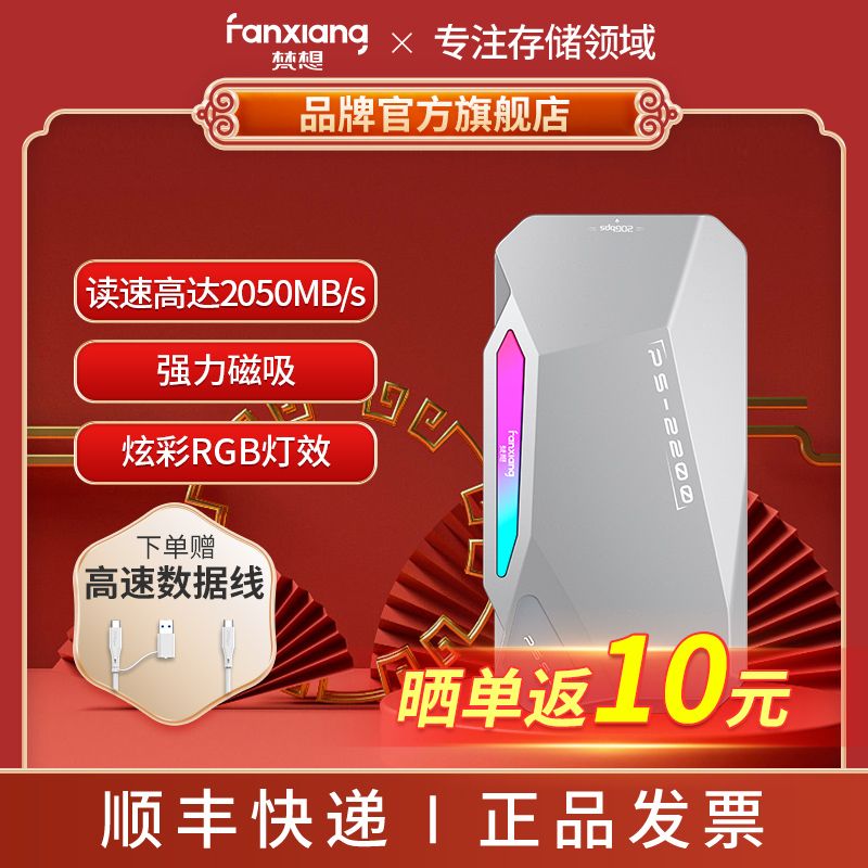 梵想PS2200磁吸通用移动固态硬盘PSSD,采用高速传输技术,读取速度高达2050MB/S,大幅提升文件传输效率,无论是大型视频、高清照片还是游戏文件都能快速拷贝,节省等待时间。独特的磁吸设计,连接稳定便捷,兼容多种设备,手机、平板、电脑轻松适配,出行携带更方便。机身融入炫彩RGB灯效,科技感十足,彰显个性品味。