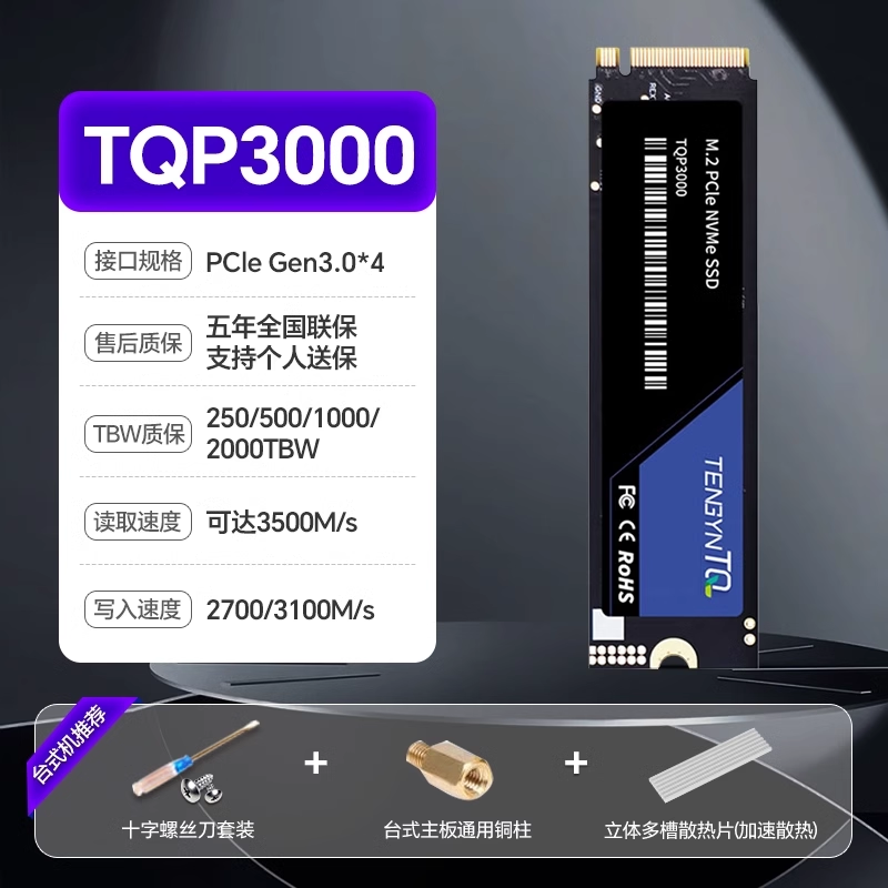 腾隐 TQP3000台式机笔记本SSD固态硬盘,采用PCIe3.0 NVMe技术,有1T、512G、256G多种容量可选,能满足不同用户的存储需求。无论是用于台式机还是笔记本,都能有效提升设备的运行速度和数据读写性能。