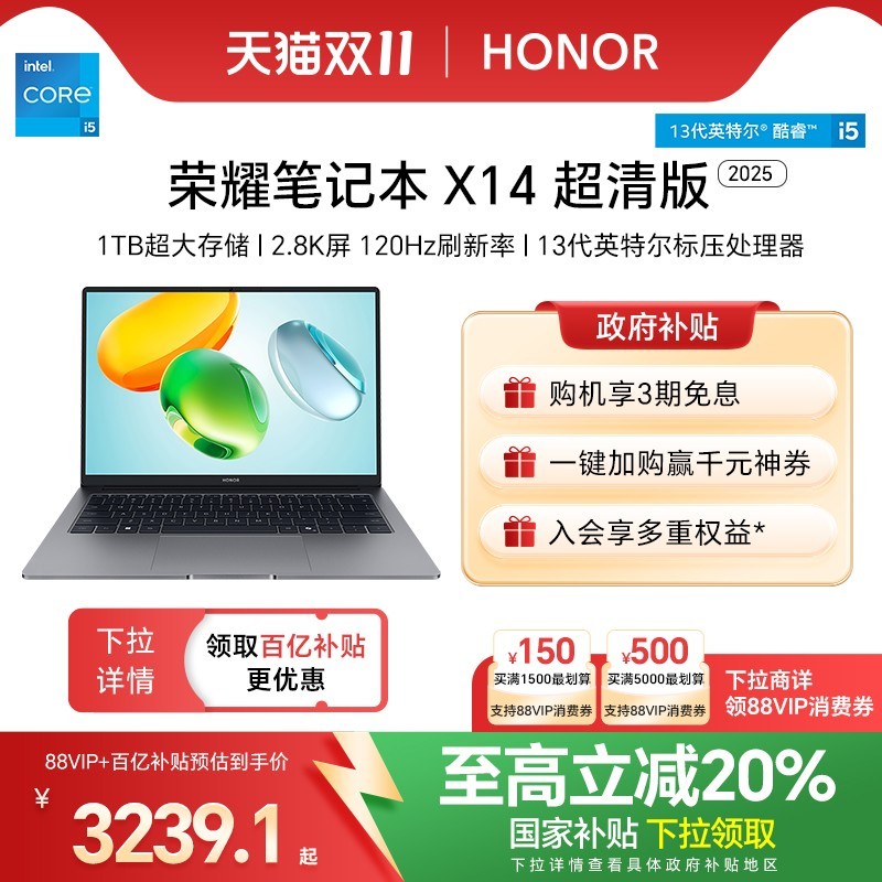 荣耀HONOR MagicBook 14 2021款轻薄本现重磅优惠,十一代酷睿版14.0英寸机型性能强劲设计轻薄,搭载i5-1135G7或i7-1165G7处理器,可选NVIDIA GeForce MX450独立显卡,运行更流畅,满足办公与娱乐双重需求。配备14英寸窄边框IPS屏幕,支持100% sRGB高色域,亮度高达300尼特,画面清晰细腻色彩真实。内置512GB PCIe NVMe SSD固态硬盘和16GB双通道DDR4内存,多任务运行不卡顿,软件启动和文件读写极速响应。支持WiFi6和MU-MIMO技术,网络速度提升约3倍,延迟降低75%,连接更稳定。特色多屏协同功能实现手机与笔记本无缝互联,最高支持一主二副三窗口同时操作,大幅提升工作效率。