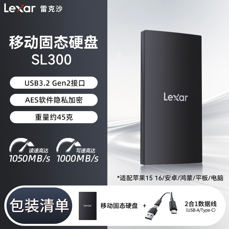 雷克沙移动固态硬盘1TB PSSD SL300高速便携存储神器震撼来袭!采用高性能主控与高品质颗粒,读取速度高达1050MB/s,大幅缩短文件传输时间,轻松应对大文件备份、视频剪辑和游戏加载。小巧轻便的机身设计,兼容手机与电脑,Type-C接口即插即用,支持多种设备无缝切换,无论是办公还是出行都能随心携带。