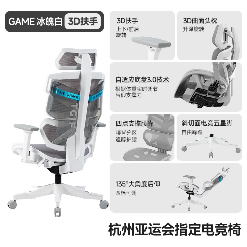 TGIF亚运会电竞椅专为电竞爱好者和长时间办公人群设计,采用人体工学结构,贴合背部曲线,提供强力腰部支撑,有效缓解久坐疲劳。椅子配备可调节头枕与腰靠,高密度海绵坐垫柔软回弹,透气网布材质清爽不闷热,四季适用。360°旋转底盘搭配静音滚轮,移动顺滑稳定,PU护边加厚扶手提升使用舒适度。适用于LPL职业赛场标准,品质经得起考验。