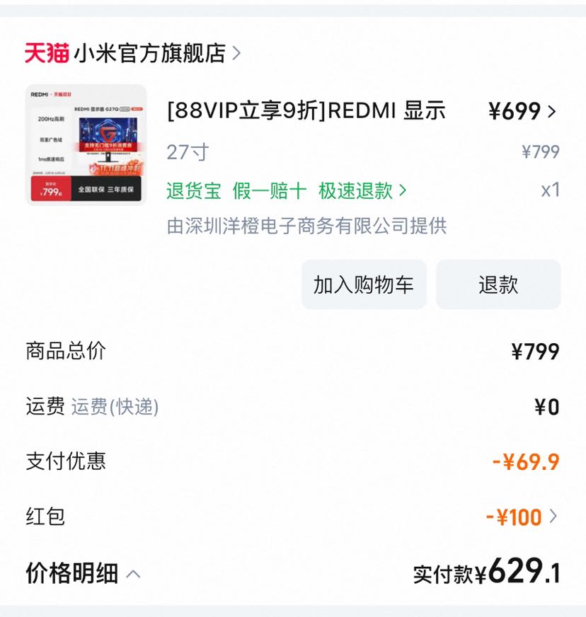 红米G27Q显示器现正火热促销中,这款高性价比电竞级显示器原本售价799元,现在参与天猫精选优惠活动,享受10%补贴立减69.5元,再叠加平台600减100的百亿超级加补红包,最终到手价仅需629.1元,直降近170元,超值入手不容错过!红米G27Q搭载27英寸2K分辨率IPS屏幕,支持165Hz高刷新率和1ms快速响应,画面流畅顺滑,无论是游戏对战还是日常办公都能带来极致视觉体验。具备DC调光、低蓝光模式,有效减少眼疲劳,长时间使用更舒适。三面窄边框设计时尚简约,轻松融入各种桌面环境。接口丰富,配备HDMI和DP接口,兼容多种设备连接。品质可靠,性能出众,现以629.1元的惊喜价带回家,机会难得,抢完即止!