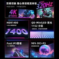 KTC 27英寸4K电竞显示器M27P6震撼来袭,采用先进的QD量子点MiniLED技术,带来高达160Hz双模刷新率并支持超频320Hz,画面丝滑流畅,告别拖影卡顿,畅享极致顺滑游戏体验;支持HDR1400高动态范围,亮度更高、对比更强,明暗细节栩栩如生;配备4K超高清分辨率,画面细腻入微,色彩精准还原,无论是游戏竞技还是影视创作都能轻松胜任;Type-C 65W反向供电接口,一线连接笔记本,传输画面同时为设备充电,简洁高效;支持旋转升降支架,自由调节高度、角度、竖屏,适配多种使用场景。