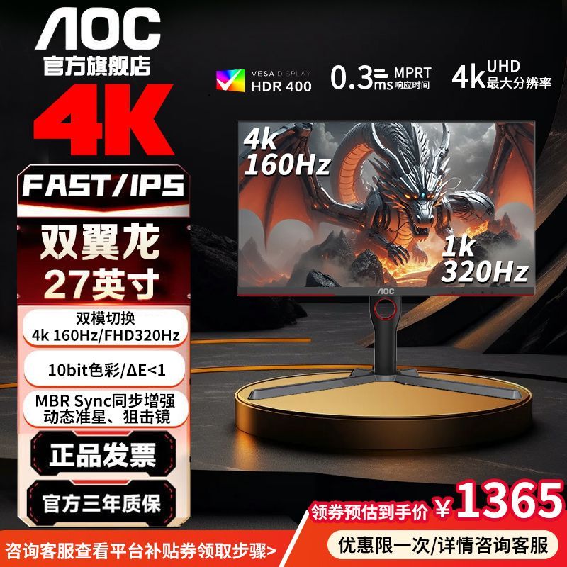 AOC U27G3 27寸4K电竞显示器震撼低价来袭,现活动售价仅1459元,下单立享9.7折,再叠加9折平台消费券,实付低至1365元,直降近百元,机会不容错过!这款高端电竞显示器采用Fast IPS面板,支持4K分辨率与160Hz高刷新率,带来极致清晰流畅的视觉体验,同时支持FHD模式下高达320Hz的超频刷新率,双模切换满足不同场景需求,无论是激烈竞技还是日常办公都能轻松应对。色彩表现方面,覆盖99% sRGB色域,画面真实细腻,响应速度快至1ms,有效减少拖影,助你抢占先机。外观设计时尚简约,三边窄边框提升沉浸感,支持多角度调节支架,适配各种使用环境。现在入手仅需1365元,性价比爆棚,快来抢购吧!