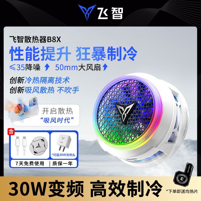 飞智B8X手机吸风磁吸散热器全新升级半导体降温技术,强力智能超频散热,专为高性能游戏场景打造,无论是长时间畅玩原神还是高强度游戏直播都能快速降温,保持设备冷静高效运行。创新磁吸+吸附双模式设计,适配多种手机和平板机型,安装稳固便捷,同时搭载大尺寸涡轮风扇实现主动吸风散热,有效避免机身发烫导致的降频卡顿。
