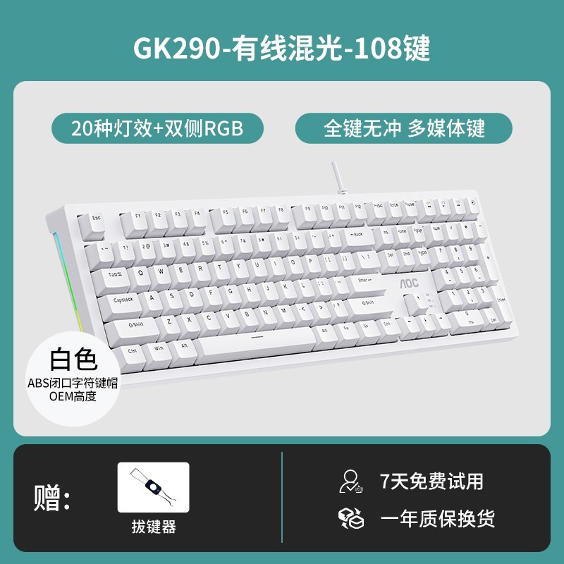 AOC有线机械键盘鼠标套装GK290现震撼降价到手价仅99.00元,原价139.00元,本次直降40元降幅达23%,低价超越上次爆料105元,性价比爆棚不容错过!该套装专为游戏电竞与办公用户打造,键盘采用青轴设计,清脆手感反馈迅速,助力游戏连招与高效打字;108键白色布局设计,搭配侧翼RGB混光灯效,炫酷电竞氛围瞬间拉满;全键无冲设计保障操作精准,无论是激烈对战还是日常办公都游刃有余。搭配同色系人体工学鼠标,握感舒适响应灵敏,整套更显协调专业。有线连接稳定低延迟,即插即用无需繁琐设置,兼容台式电脑、笔记本等多种设备。白色108键定制电竞青轴版本GK290W5现已热销来袭,99元入手高端机械外设套装,机会难得速速抢购!