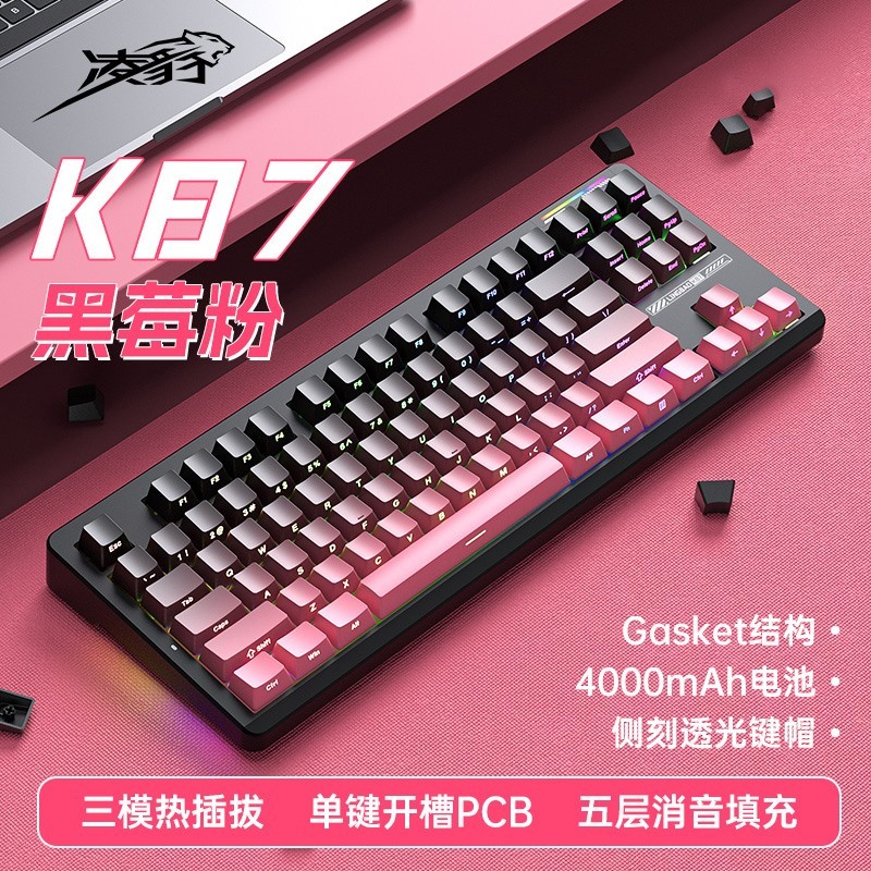 凌豹K87PRO机械键盘客制化三模无线蓝牙游戏电竞键盘,采用侧刻设计搭配黑莓粉配色,颜值与质感兼具,适合追求个性与性能的玩家。支持有线、2.4G无线和蓝牙三种连接模式,兼容多种设备,切换更自由。搭载高品质机械轴体,手感清脆响应迅速,无论是办公打字还是电竞游戏都能带来出色体验。全键无冲设计确保复杂操作精准输入,耐用性强。