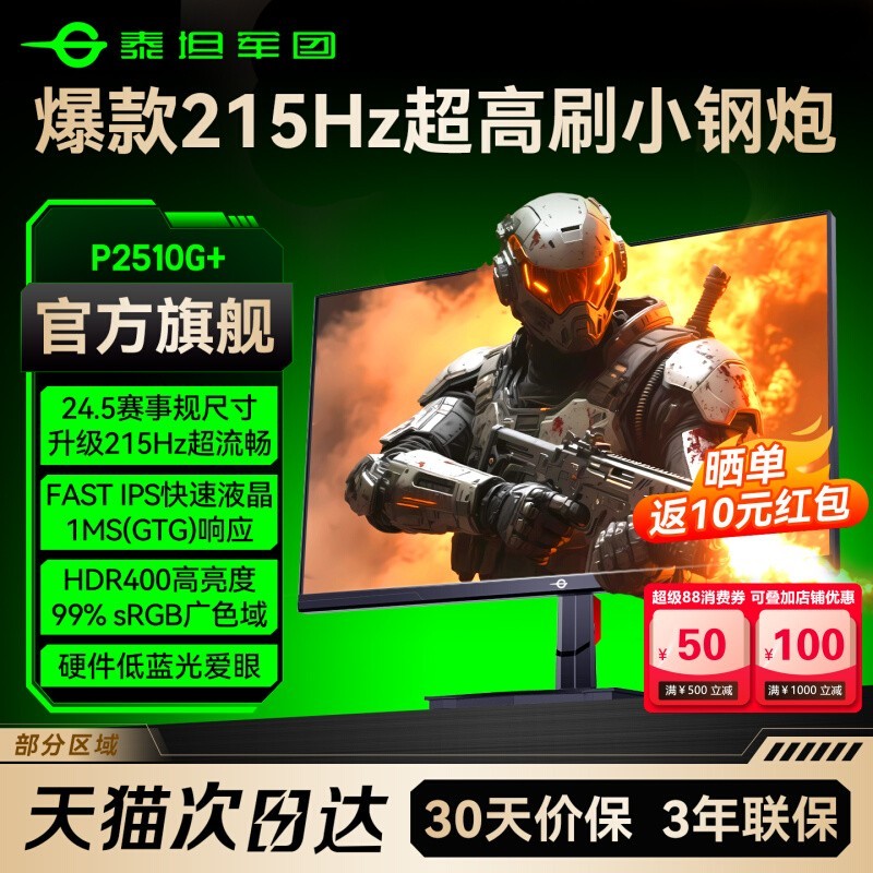 泰坦军团25英寸显示器P2510G+,专为游戏人群打造。它拥有215Hz高刷新率,还支持240Hz、144Hz,能让游戏画面更加流畅,减少画面撕裂和卡顿,为玩家带来极致的游戏体验。其1K分辨率的屏幕,可清晰呈现游戏中的每一个细节。现在这款显示器在天猫官方旗舰店特价至529元,参加88VIP消费券活动,满500立减50元,券后到手价479元。