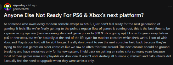 有用户在发言中提到:“除了Switch 2之外,我已拥有市面上所有的主流主机,但说实话,我还没有心理准备迎接下一代产品的到来。当前游戏发布的节奏终于趋于稳定,这正是对玩家最有利的环境。虽然我知道PS6和新Xbox至少还要几年才会面世,但一想到这一代主机的生命周期可能正在收尾,心里仍有些说不出的感觉。我希望微软和索尼能再耐心一点。我不希望看到下一代主机仍然受限于向下兼容的设计——这种情况在这一代已经足够多了。真正值得期待的,是具备突破性体验的硬件升级,以及为新平台量身打造、真正体现技术飞跃的独占作品。”