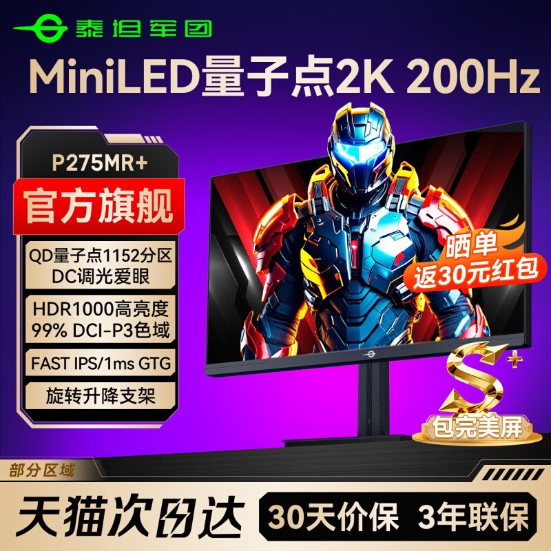 泰坦军团TITAN ARMY P275MR MiniLED显示器,27英寸2K高清大屏,搭载MiniLED背光技术,带来更出色的对比度和画面细节,支持200Hz高刷新率,响应速度快至1ms,无论是大型3A游戏还是竞技类电竞对抗都能流畅运行,画面顺滑无拖影,配合180Hz变频技术,适配不同场景需求,视觉体验更上一层楼。这款显示器专为游戏人群打造,色彩还原精准,视野开阔沉浸感强,是提升游戏体验的优质之选。