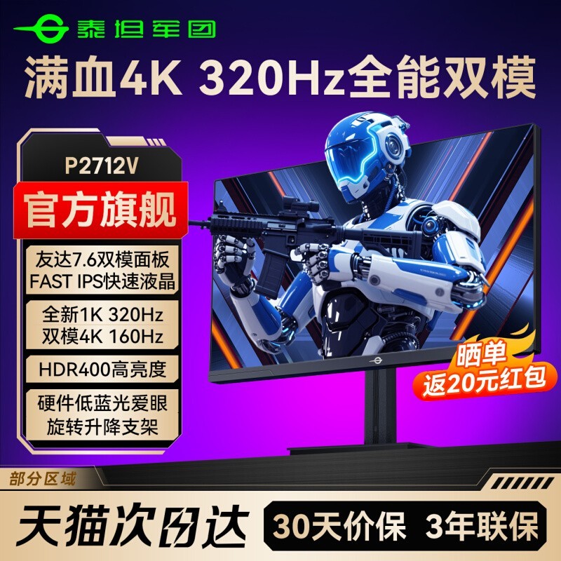 泰坦军团TITAN ARMY推出的这款27英寸显示器P2712V,专为电竞游戏人群打造。它支持4K双模,拥有144Hz高刷新率,能带来流畅顺滑的游戏画面,让玩家在游戏中享受丝滑操作体验。其采用MiniLED技术,屏幕显示效果出色。