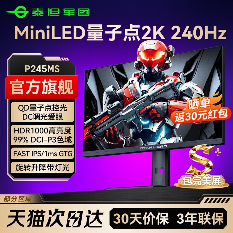 泰坦军团TITAN ARMY推出的24.5英寸2K240Hz电竞MiniLED显示器P245MS,是电竞游戏人群的理想之选。这款电脑显示器拥有24.5英寸屏幕,具备2K分辨率与240Hz高刷新率,能带来清晰流畅的游戏画面体验。