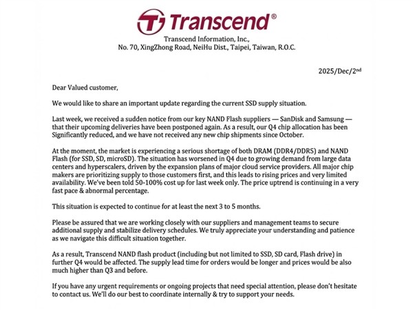 存储设备制造商创见近日向其合作代理商发出内部通告,详细说明了当前SSD供应链所面临的严峻局面。文件显示,自去年10月起,该公司便未获得任何新的NAND芯片供应,而主要供应商如闪迪与三星更进一步通知将再度推迟芯片交付时间。