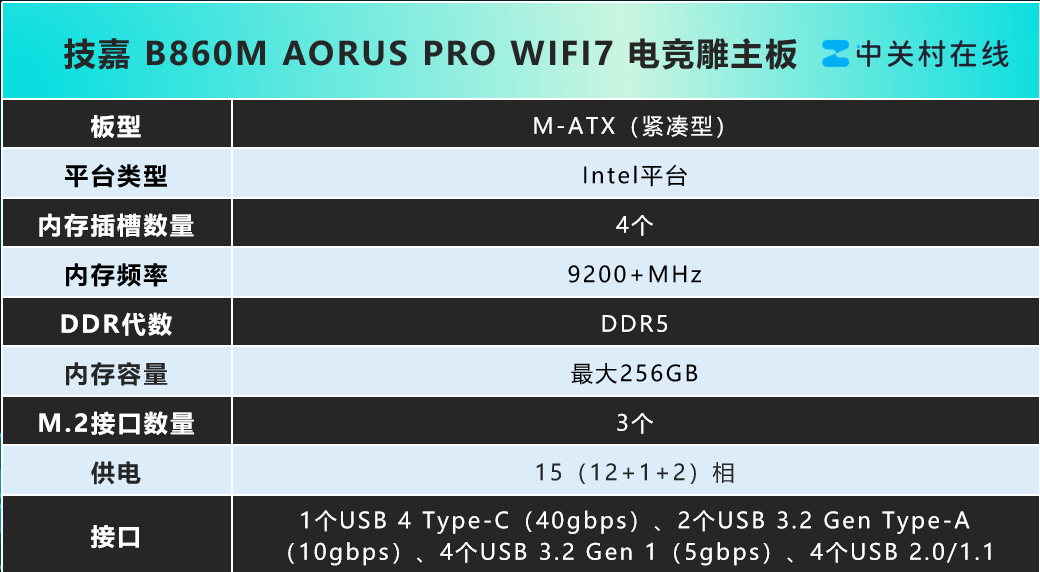 在散热与扩展上,技嘉B860M AORUS PRO WIFI7电竞雕主板采用了全覆盖式的供电散热装甲,配合上M.2散热装甲,有效地压制供电区与固态硬盘所带来的热量。扩展接口包含1个PCIe 5.0 x16显卡插槽、1个PCIe 5.0 M.2插槽、2个PCIe 4.0 M.2插槽、后置USB 4 Type-C(40Gbps)、2.5G网卡与Wi-Fi7模块等,兼顾高速存储、多屏输出与低延迟网络,为游戏、直播、剪辑等场景提供全能支撑。