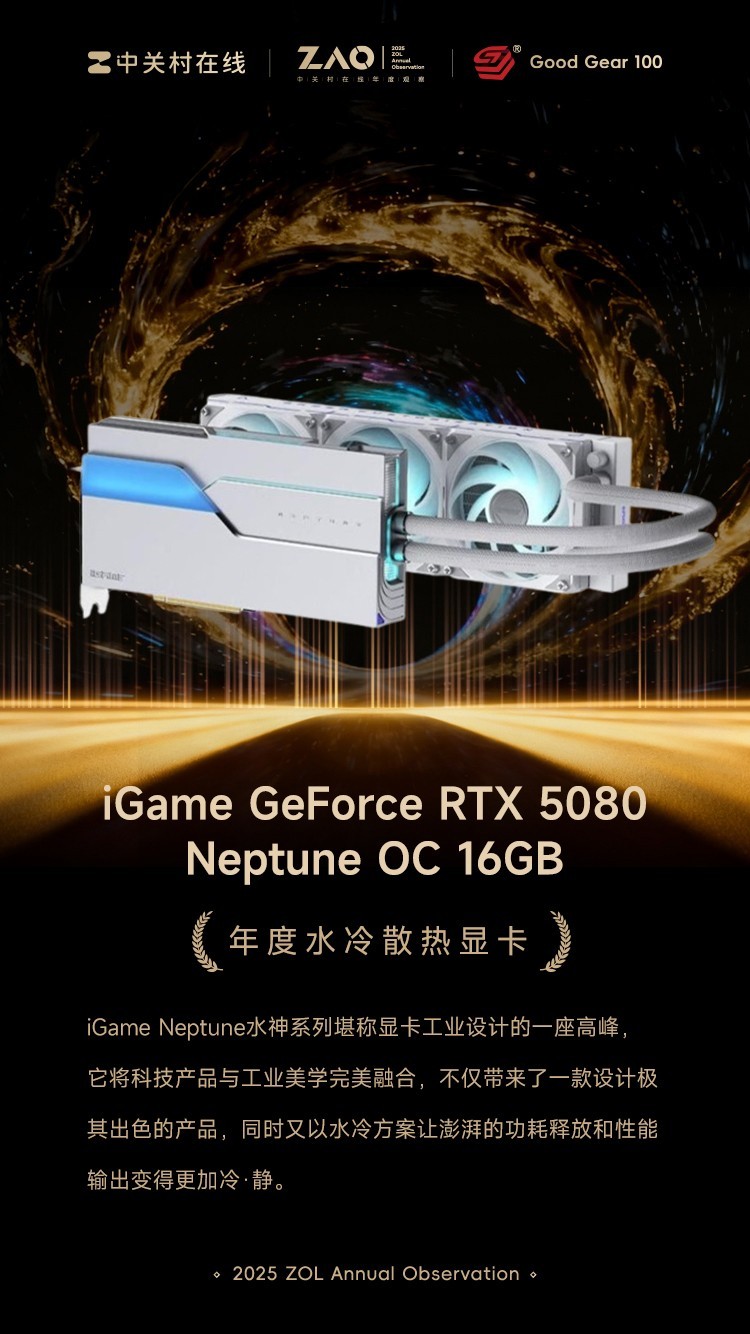 2025年度百大优秀科技产品:年度水冷散热显卡 iGame GeForce RTX 5080 Neptune OC 16GB