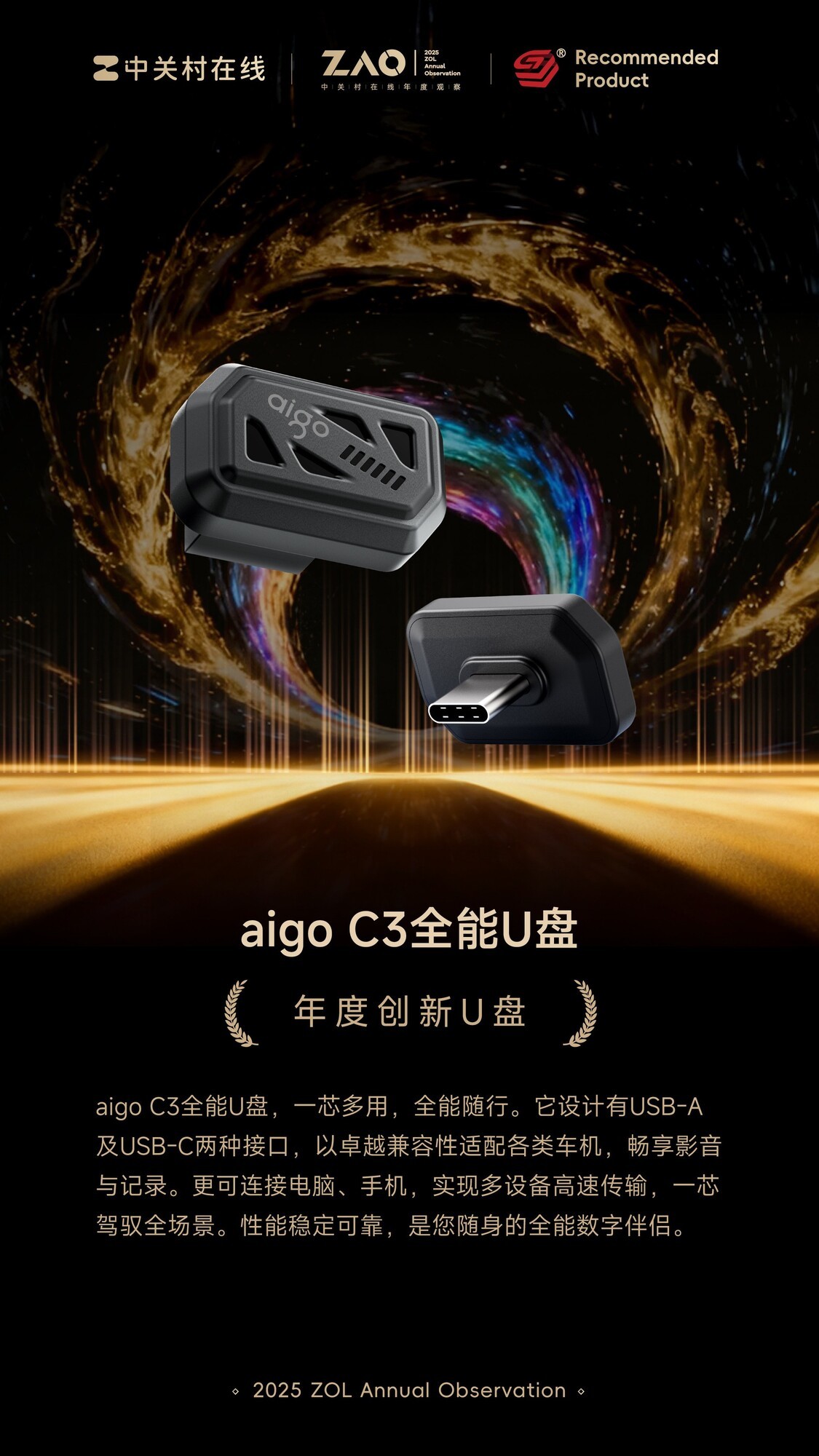 【ZOL中关村在线原创新闻】ZAO 2025中关村在线年度观察项目推选“2025年度推荐产品”,为你甄选2025年度优秀科技产品。2025年度推荐产品:年度创新全能U盘-aigo C3全能U盘获奖理由:aigo C3全能U盘,一芯多用,全能随行。它设计有USB-A 及USB-C两种接口,以卓越兼容性适...